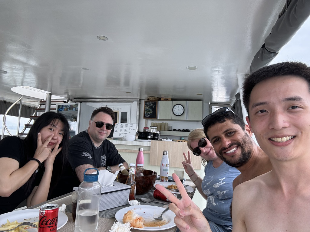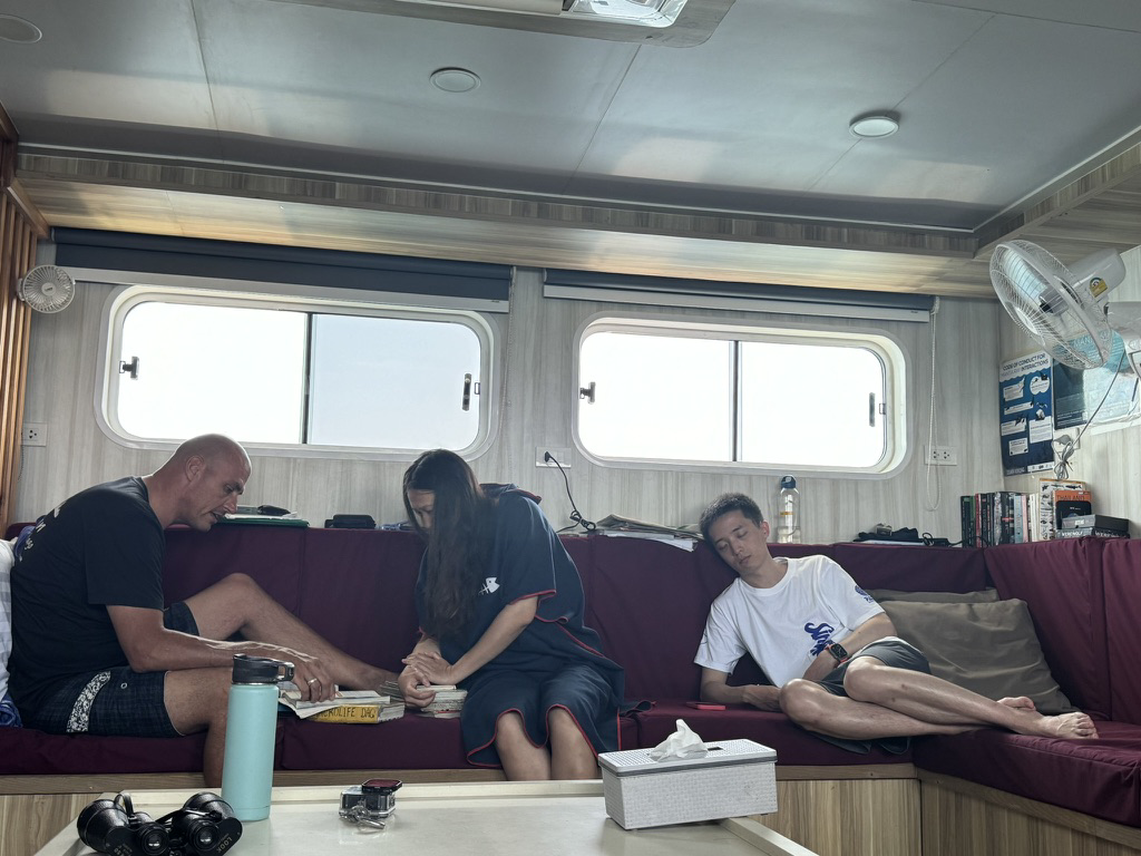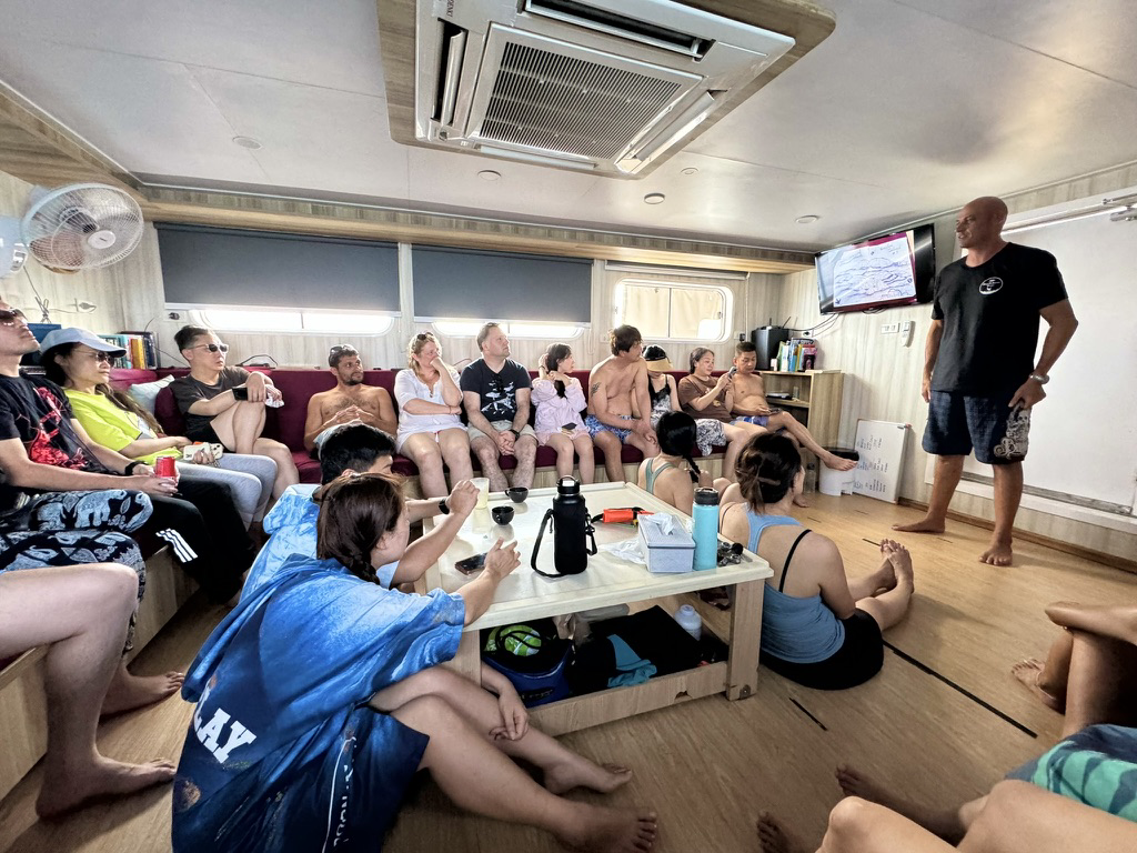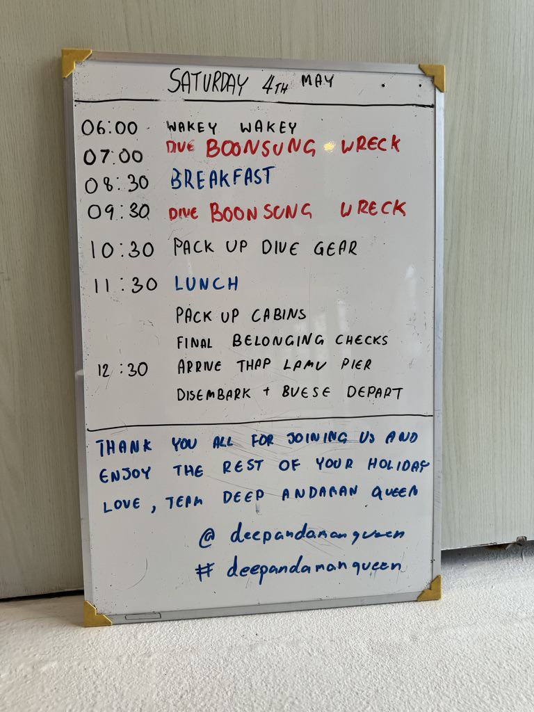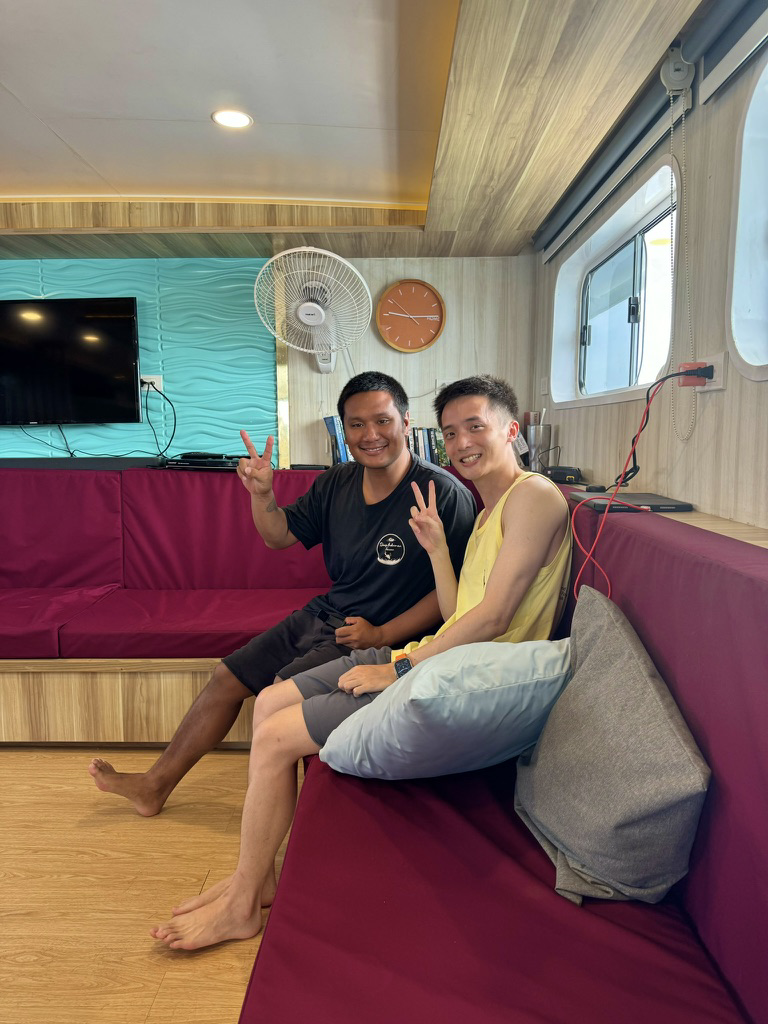 这是第一次船宿,订的船叫 Deep Andaman Queen,五天四夜(4.30-5.4),一共 14 潜,订这艘船其实是听说只有英文潜导,想着国人会少一些,没想到这回赶上一个国人的团体,船上一半都是国人,还有几个香港人。大潜导是个英国人,叫 Steve。